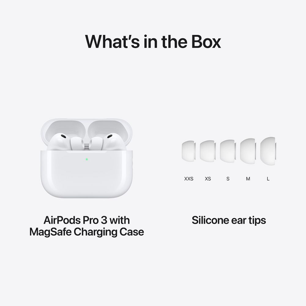 These Apple AirPods Pro 3 deliver an upgraded audio experience with enhanced Active Noise Cancellation and heart rate sensing during workouts. They feature a refined in-ear fit, improved battery life and support for Live Translation to help you stay connected across languages. Plus, they offer up to 10 hours of battery life in Transparency mode.